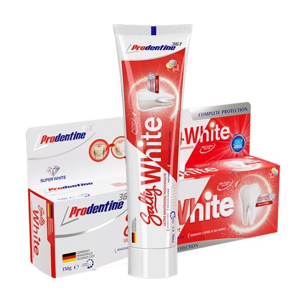 چای، قهوه و سیگار از اصلیترین عوامل ایجاد لک روی دندان و زرد شدن آن است. خمیر دندان پرودنتین 361 مدل Salty White دارای ذرات ریز اسکرابی هستند که روی مینای دندان اثر سایشی دارند. با از بین بردن جرم، پلاک در لایهی خارجی دندان به کمک این ذرات، لایهی سفید و درخشان زیرین نمایان میشود.